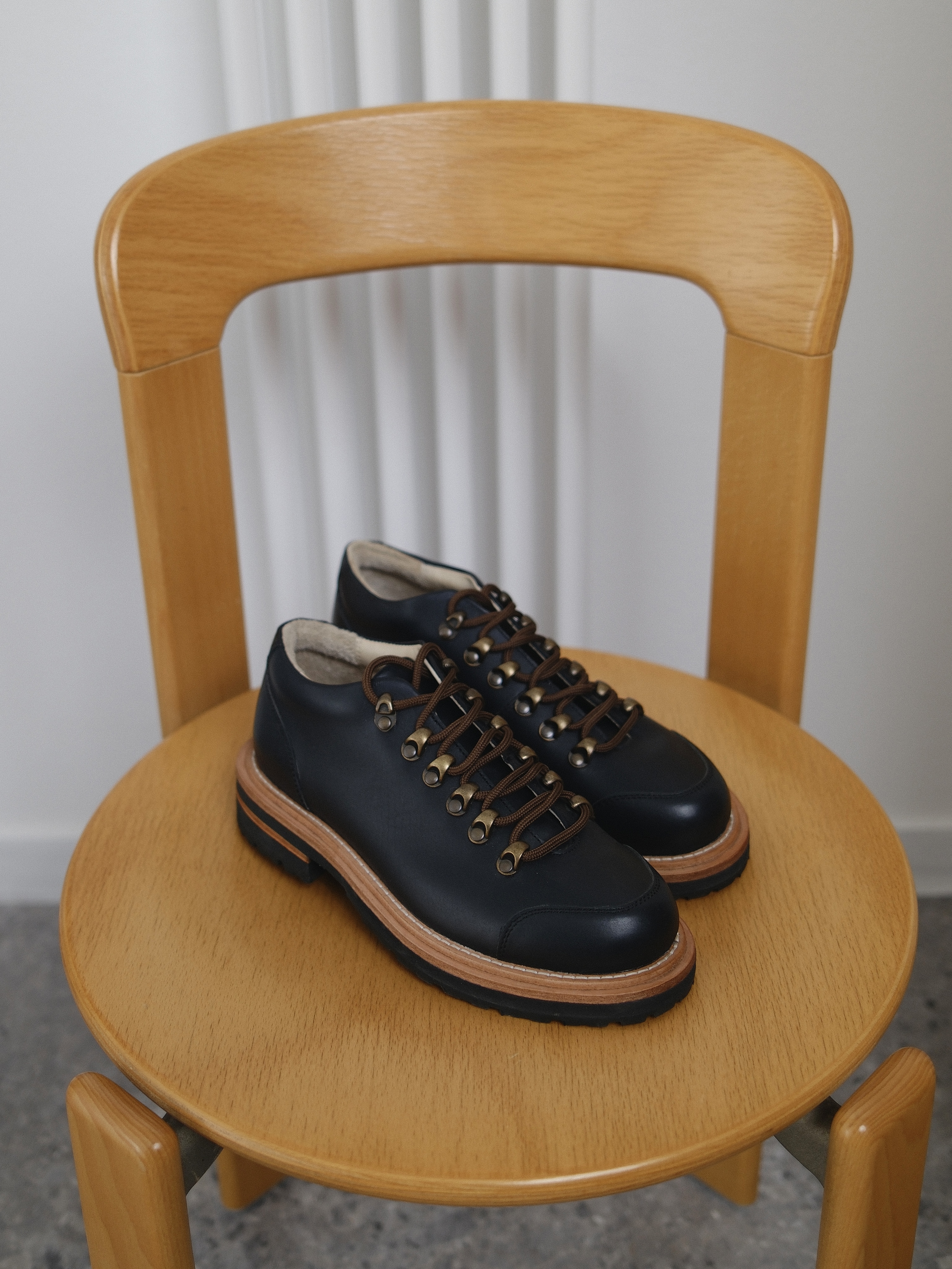 Эти ботинки вдохновлены классической альпинистской обувью, но адаптированы для города. Минималистичный дизайн сочетается с прочностью и комфортом: верх выполнен из черной кожи премиального качества, произведённой в Нидерландах, а массивная подошва обеспечивает надежную поддержку.