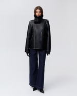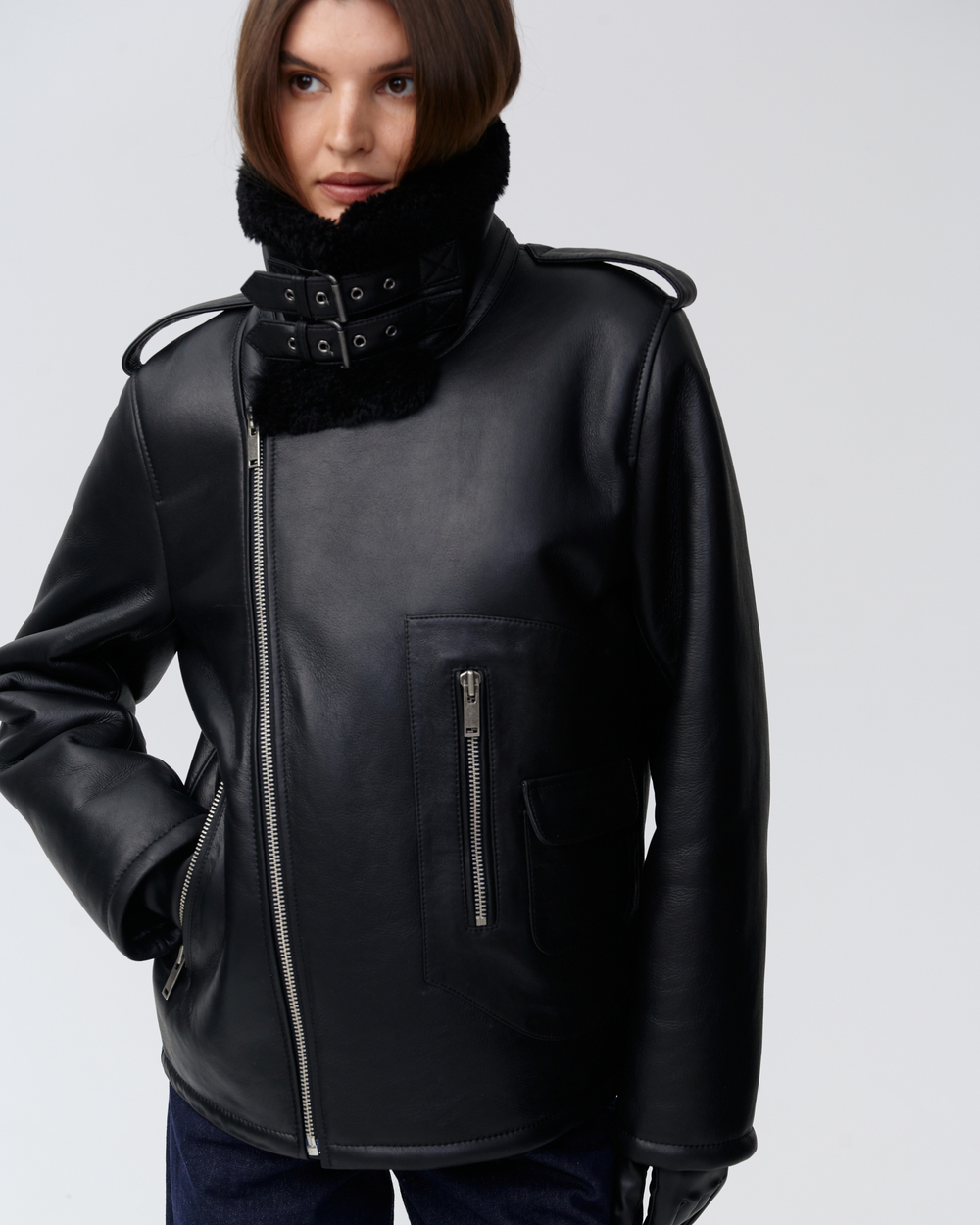 Высокий ворот с функциональными ремешками защитит от ветра и холода. Для пошива изделия мы использовали плотную мягкую овчину. Изнаночная фактурная сторона с плотными завитками хорошо сохраняет тепло, а лицевая кожаная отталкивает влагу и защищает от ветра.