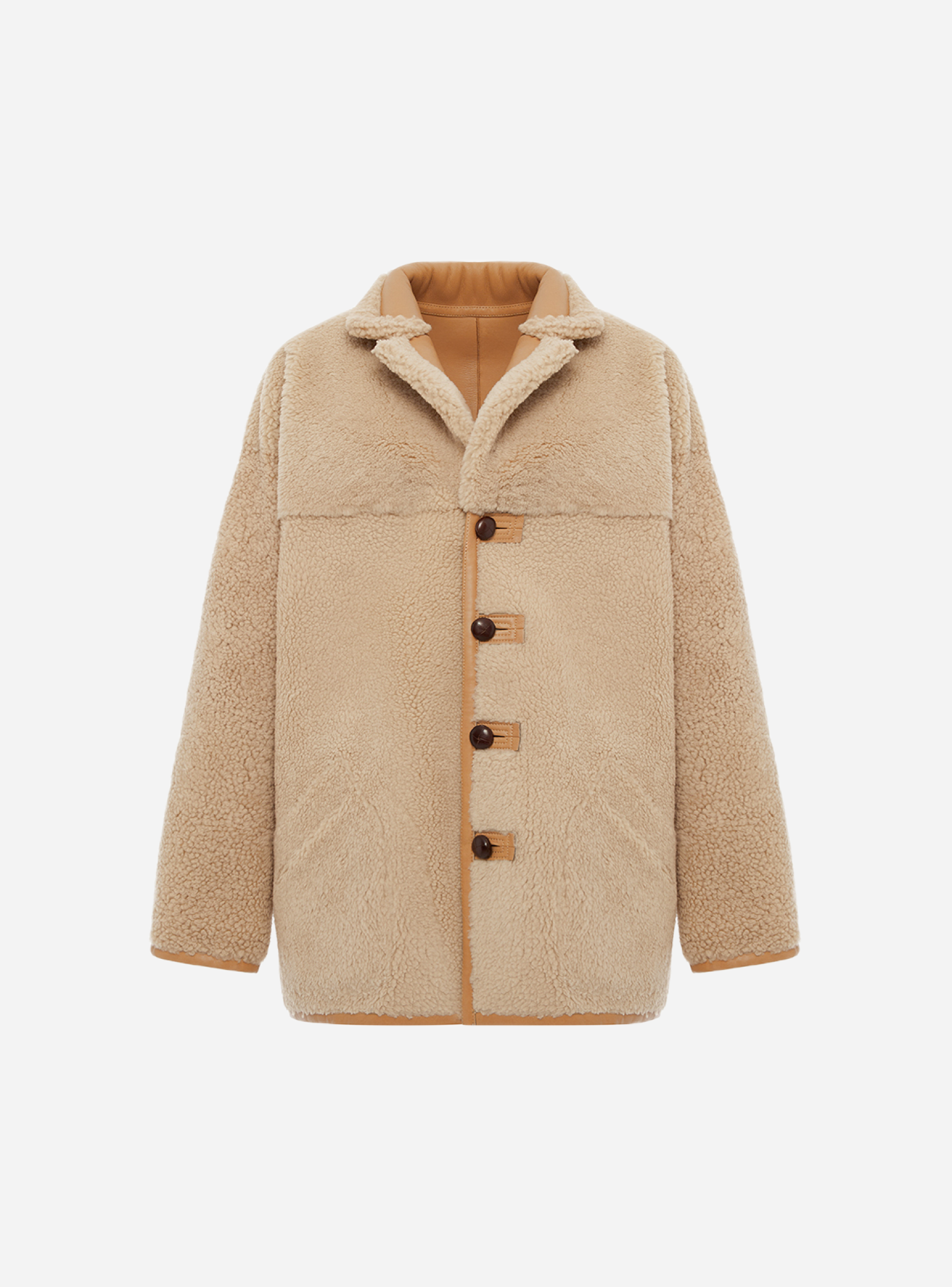 Однобортная двусторонняя дубленка с английским воротом, спущенной линией плеча и втачным рукавом. Натуральная овчина с плотным мехом средней длины ворса и внешним покрытием из гладкой кожи наппа. Застегивается с обеих сторон на пуговицы. Функциональные карманы присутствуют с обеих сторон.