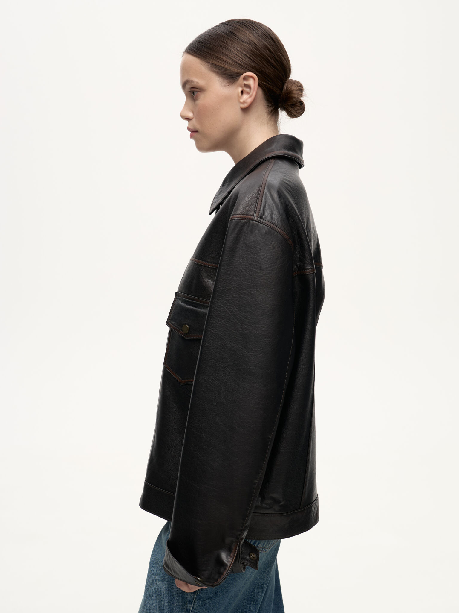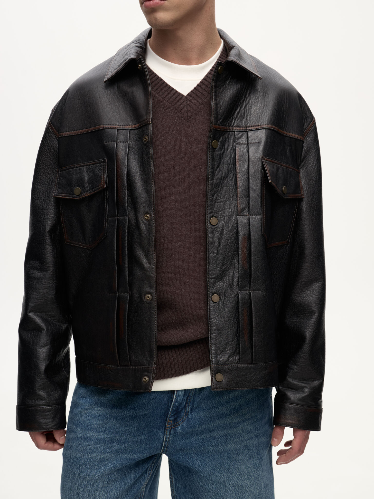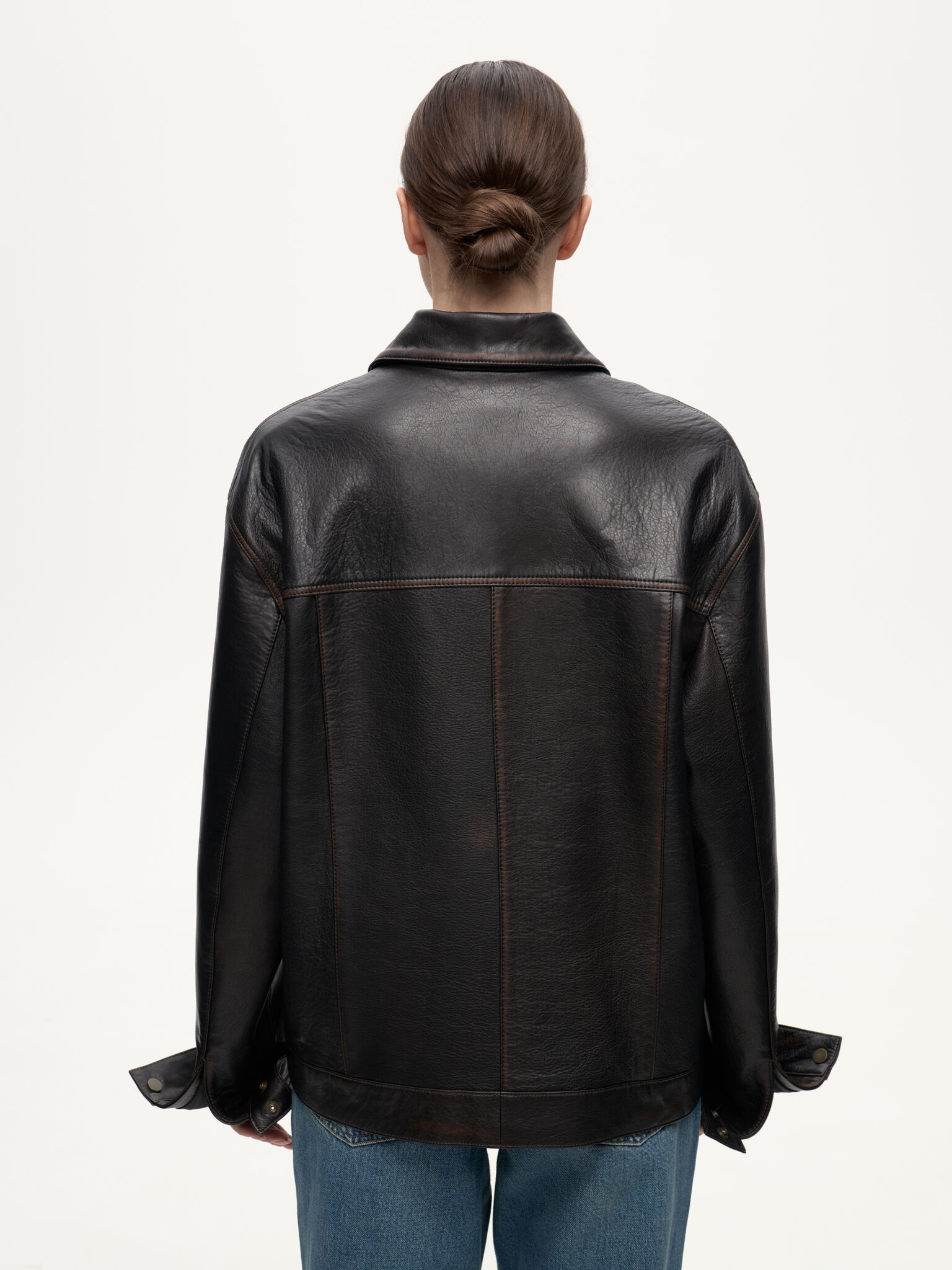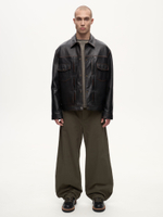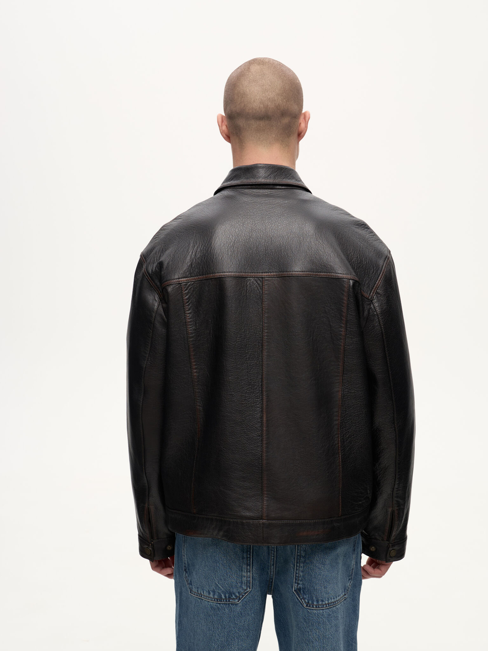 Selvedge Jacket — кожаная интерпретация классической джинсовой куртки. Фактурная зернистая кожа вручную затирается по краям, создавая выразительный винтажный эффект. Вдохновлённая японским мастерством денима, эта модель соединяет в себе эстетику традиционного кроя и характерную глубину кожи, превращая повседневный силуэт в предмет со своей историей.