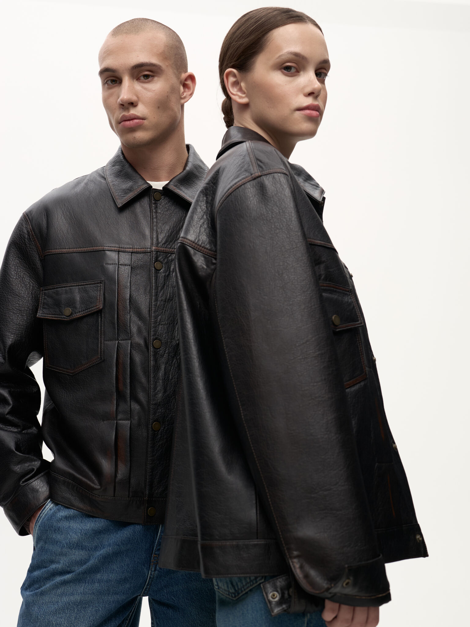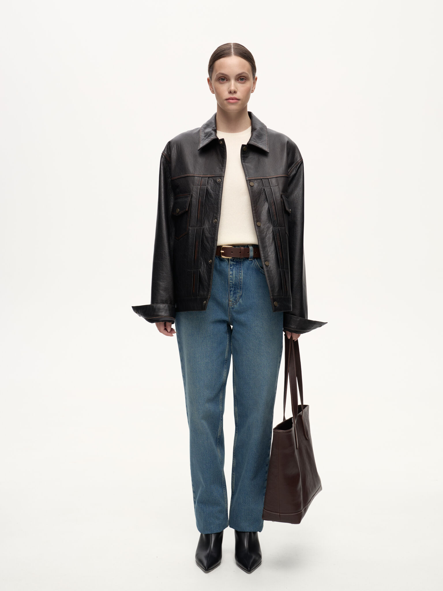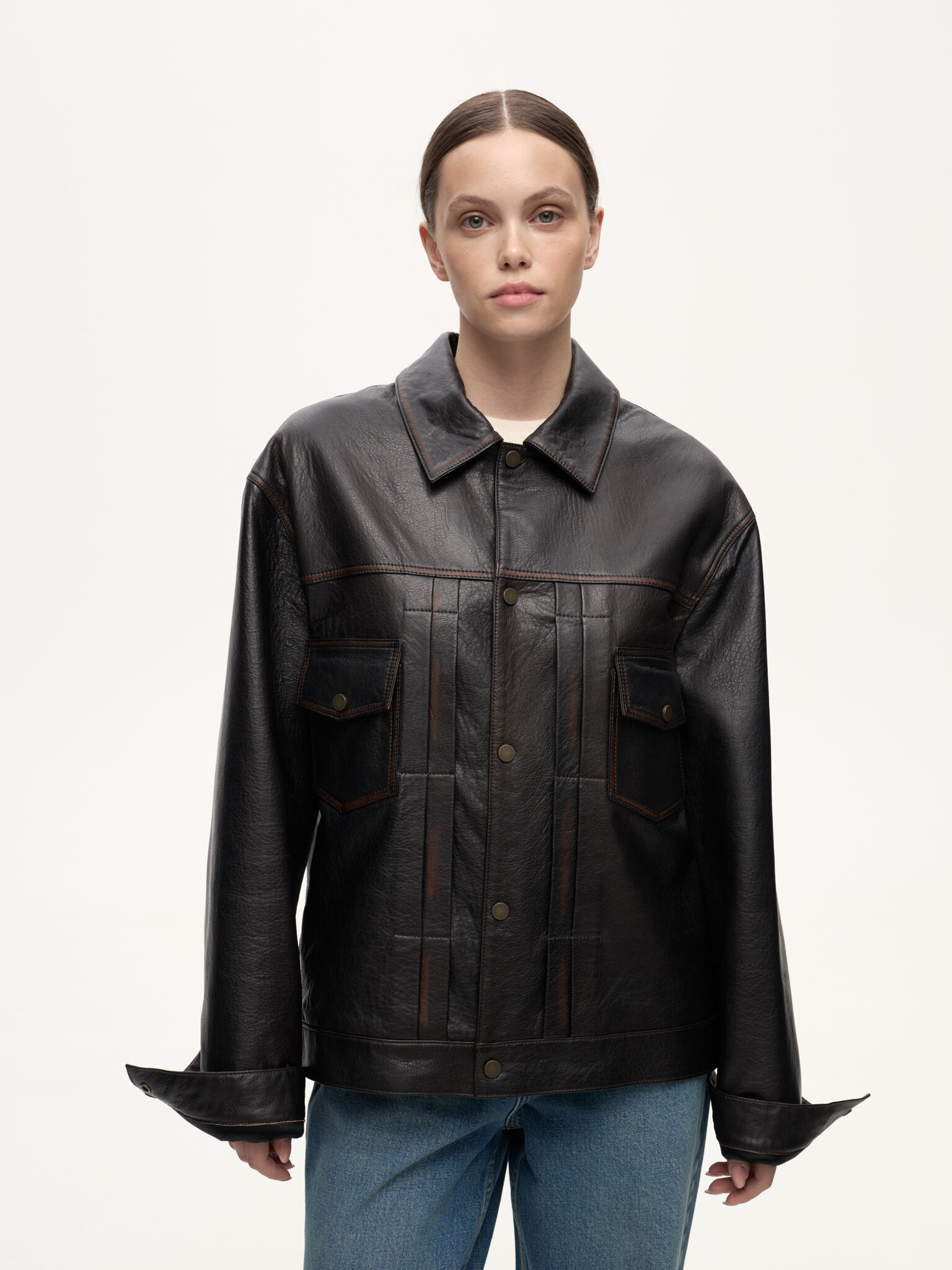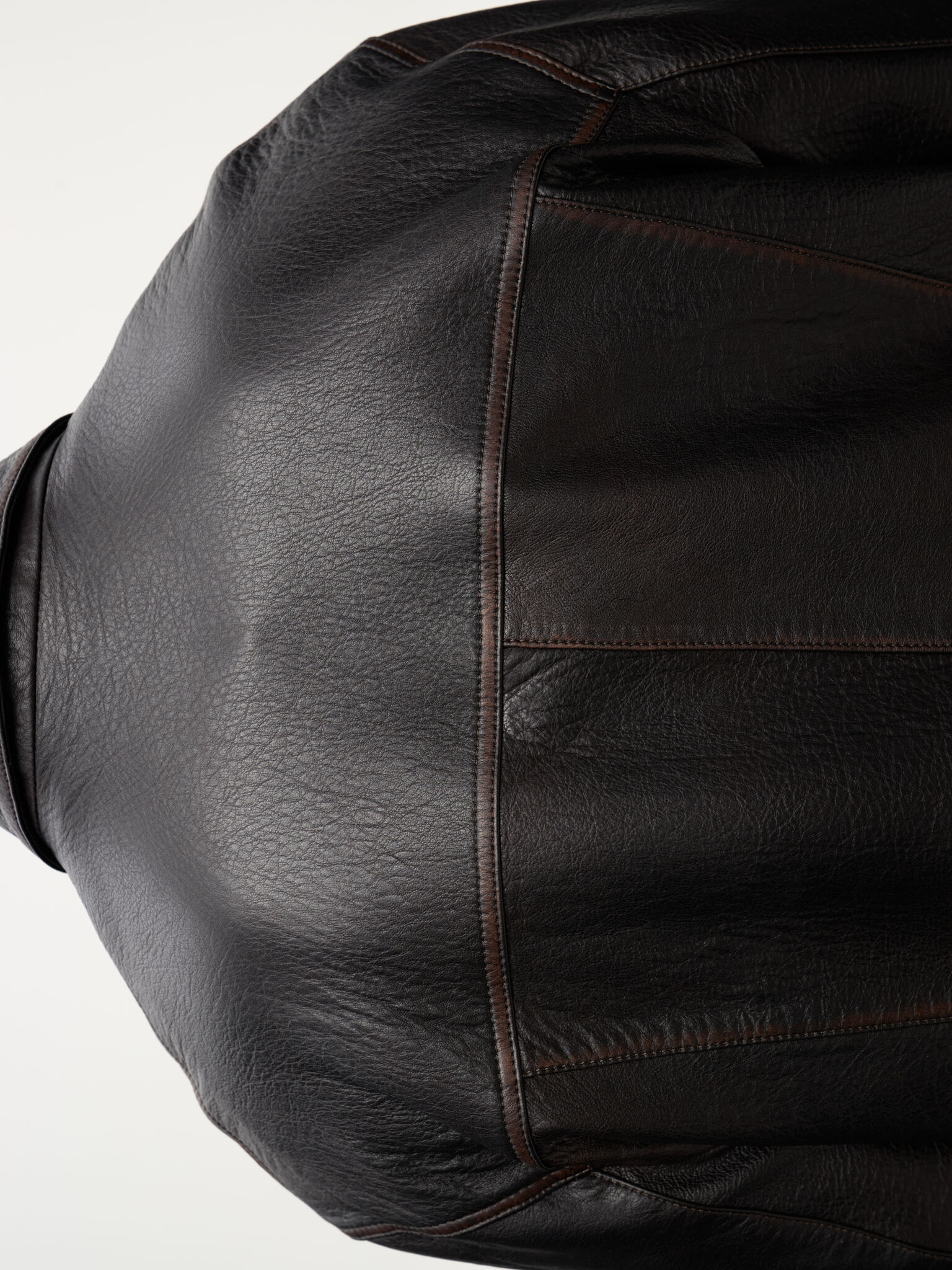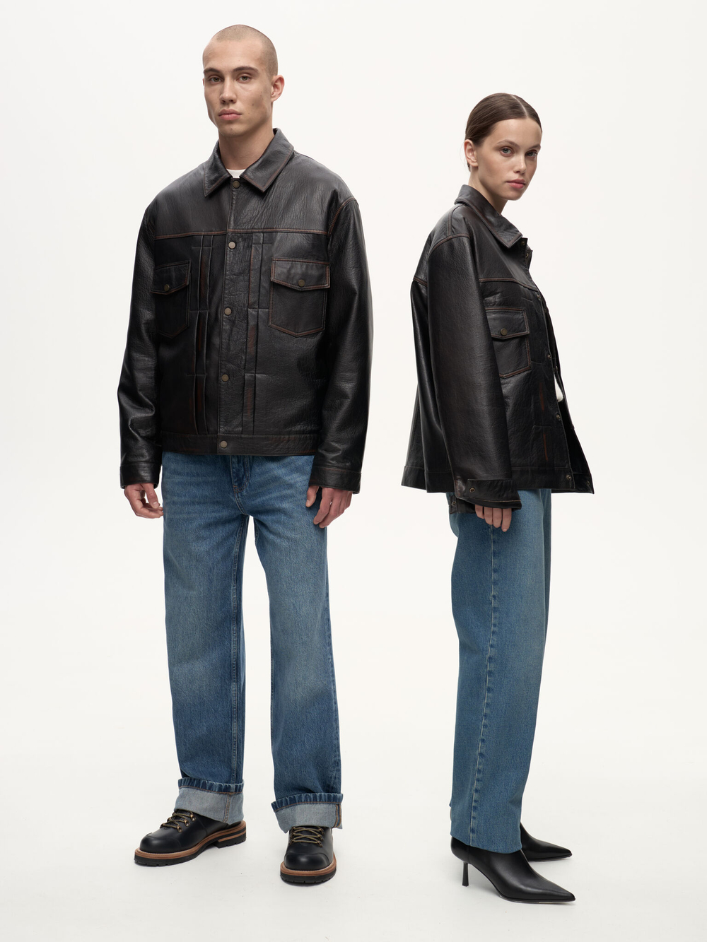 Selvedge Jacket — кожаная интерпретация классической джинсовой куртки. Фактурная зернистая кожа вручную затирается по краям, создавая выразительный винтажный эффект. Вдохновлённая японским мастерством денима, эта модель соединяет в себе эстетику традиционного кроя и характерную глубину кожи, превращая повседневный силуэт в предмет со своей историей.