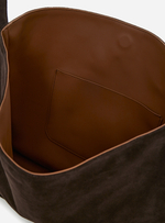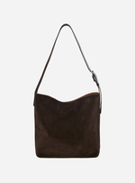 Изделие выполнено из мягкой замши благородного шоколадного оттенка и дополнено кожаным ремнём, который позволяет носить сумку как на плече, так и кросс-боди.